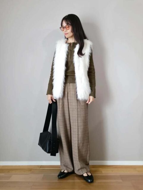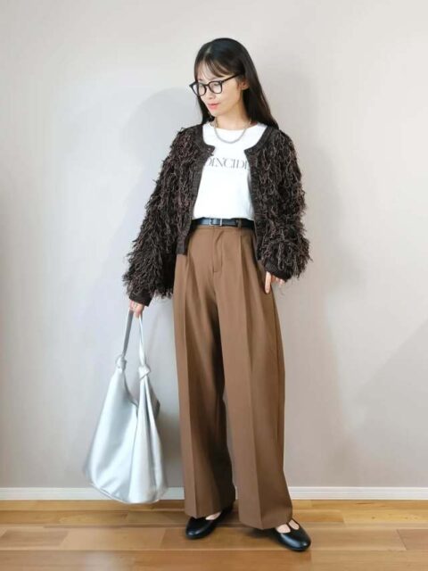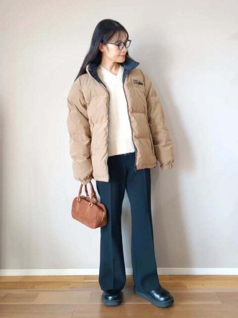 冬は裾まわりがゆったりしたセンタープレスパンツに「ショートブーツ」を合わせてみて。このときブーツが浮いて見えないよう、パンツと同系色で揃えるのがコツです。色味が馴染むことでアイテムのつながりがよくなり、スタイリングがまとまります。
