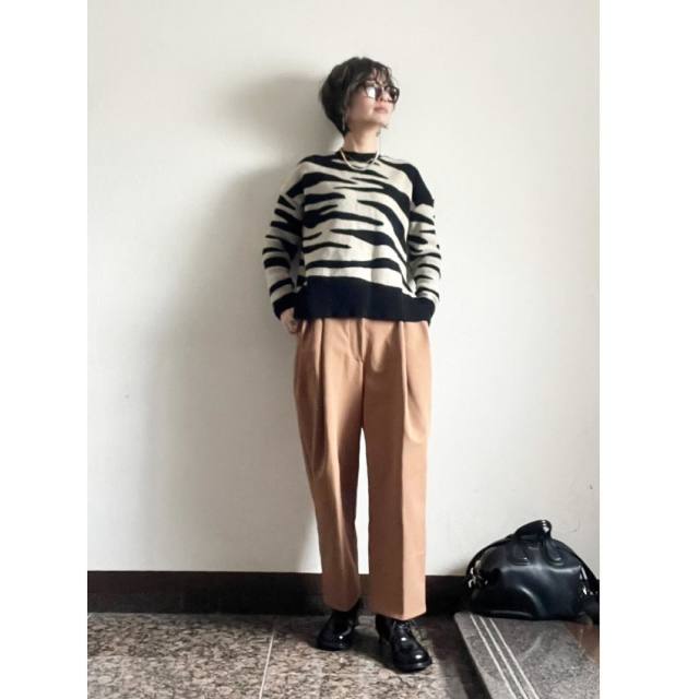 センタープレスパンツならではの組み合わせが「お目立ちな色柄の靴」。レオパード柄やメタリックカラーといったインパクトのある靴も、きれいめなパンツが程よく上品に決めてくれます。