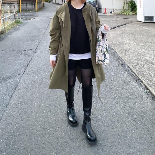 「ロングブーツにトレンチコートを羽織ると大げさに見える」、そんなときは短め丈のトレンチを選んでみて。軽やかでカジュアルに着こなせます。