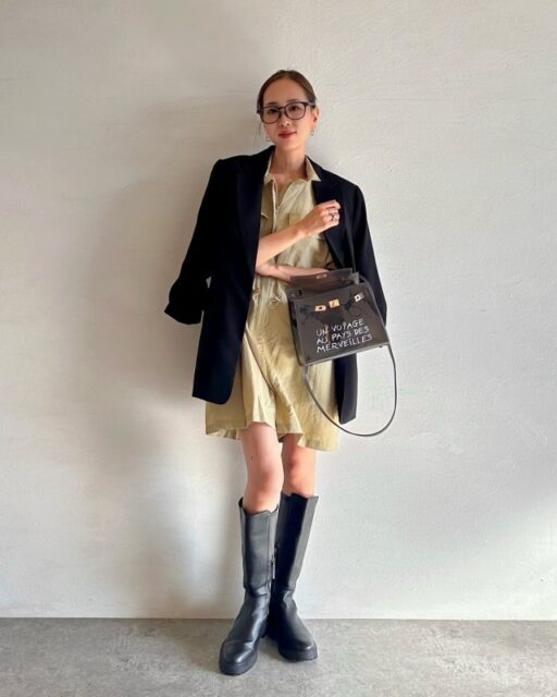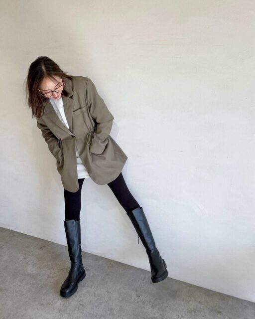 カッチリした「ミドル丈ジャケット」を羽織ればロングブーツコーデが大人っぽくアップデート。長め丈のジャケットがお尻や腰あたりまですっぽりカバーしてくれますよ。さらにミニ丈ボトムに合わせてみるのもおすすめです。子どもっぽくなりがちなミニワンピースだってハンサムな印象に。