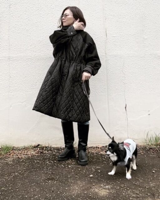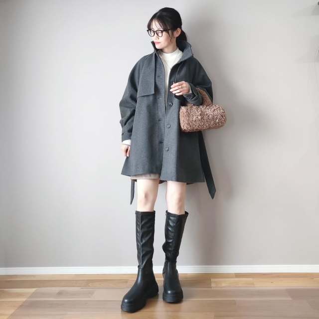 ロングブーツとロングコートの組み合わせは布面積が多くなるため、のっぺり見えることも。そんなときは「ウエストドロスト」のコートを選ぶのが◎です。ヒモを引っ張ることでウエストにメリハリが生まれ、立体的なシルエットに。コーデに抑揚がつきおしゃれにまとまります。
