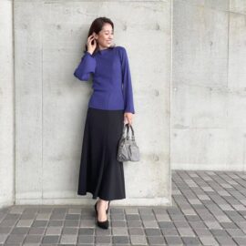 合わせるボトムのイチ押しは黒のタイトスカート。インナーを替えればオールシーズン活用できるコンビです。