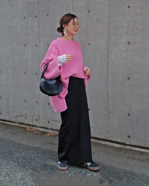 モードな白黒コーデに合うのは、存在感のある大ぶりなフープのピアス・イヤリング。シンプルで無駄のない装いだからこそ、インパクトのあるデザインが似合います。