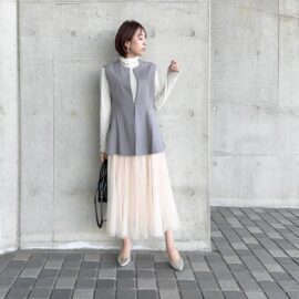 40代の女性なら、シンプルな黒ビスチェがうってつけ。「ゆったりめのブラウス」に重ねるだけで、流行りのレイヤードスタイルを演出します。トップスの裾出しスタイルをおしゃれに見せつつ、ウエストまわりの体型カバーにも役立ちますよ。