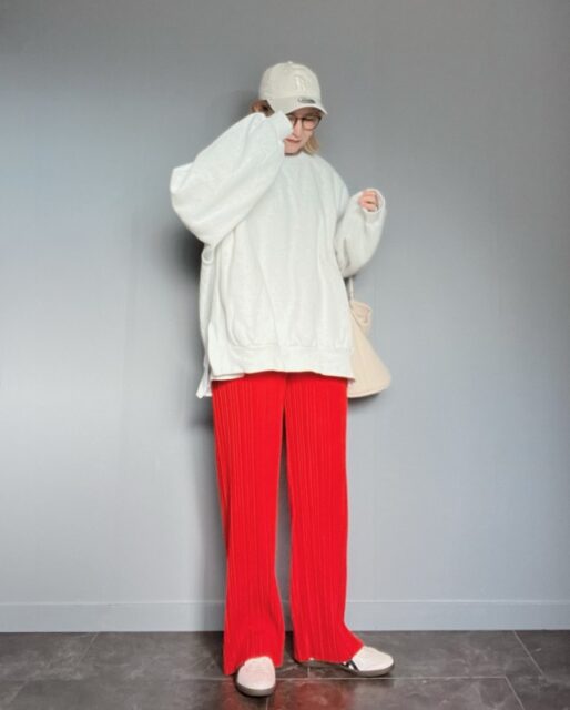 2|楽ちんと着映えを両立する上下カラースウェットのコーデ