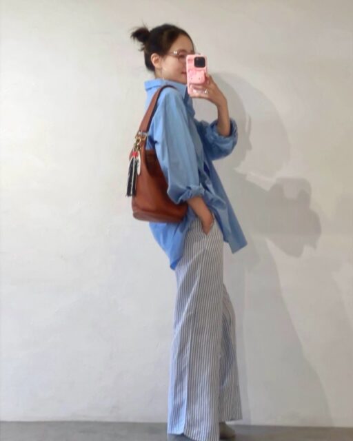 すっきりときれいめにまとまるのが、シャツ×ストライプパンツで作るブルーのワンカラーコーデ。軽やかで動きやすいクリーンな着こなしに仕上がります。