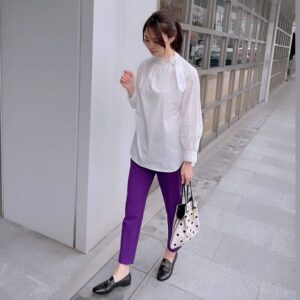 きれいめ派さんにおすすめなのが「ボリューミーな映えブラウス」とのコンビ。カッチリしたテーパードパンツが存在感たっぷりなブラウスを引き立てつつ、派手見えを解消。合わせるだけでスタイリングがサマ見えするコンビです。