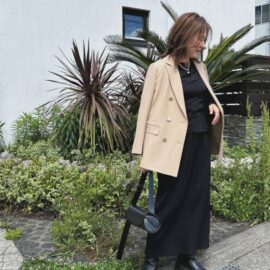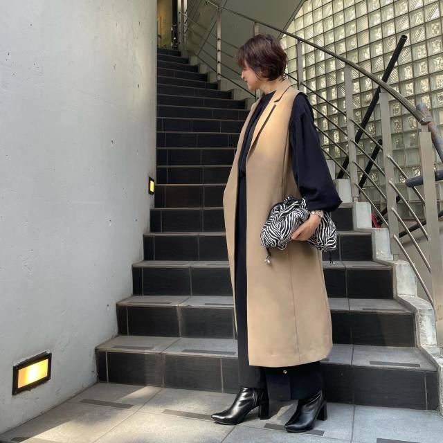 ボリューム袖やフリルなど甘めの黒ブラウスに合わせる羽織モノは、ベージュのトレンチコート・ロングジレがおすすめ。どちらもカッチリとした雰囲気があり、黒ブラウスを引き締めて大人っぽくアップデート。ガバッと羽織るだけでサマになりますよ。