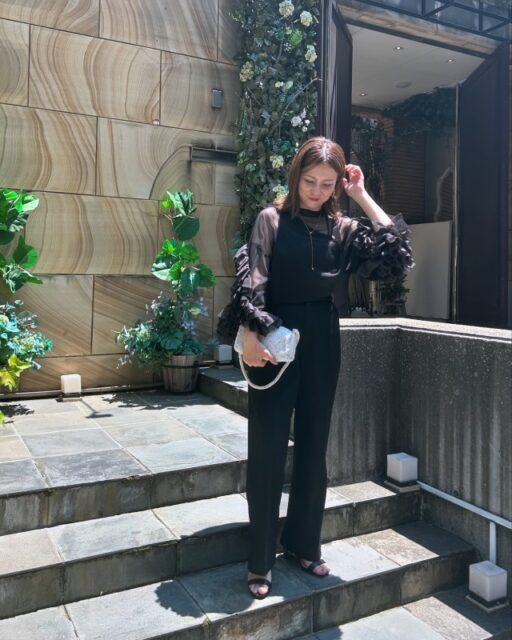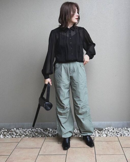 流行りのシアートップスは50代にとってハードル高く感じるもの。しかし「黒のシアーブラウス」なら大丈夫。大人っぽいうえに、シックな色が透け感を程よく抑えてコーデが落ち着きます。加えて黒のインナーを合わせれば透け見え対策も万全。