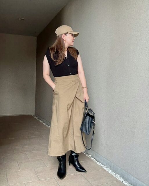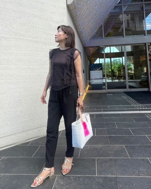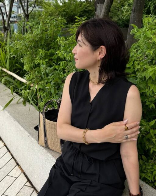 真夏にうってつけなのが「Vネック&ノースリーブの黒ブラウス」。襟元のシャープなVネックに視線が集まるので、ノースリーブを着るハードルがダウン。肌を出すことで熱がこもらず、見た目も涼しげなコーデに決まります。