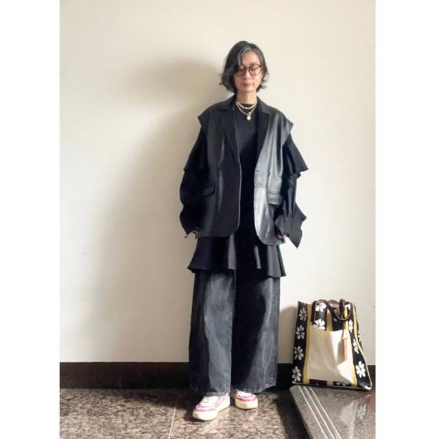 フェミニンな黒チュニックブラウスに「黒レザーベスト」を羽織る着こなしもおすすめ。ベストの辛味が効いて、甘いチュニックの印象がガラリと印象チェンジ。そこへ黒のパンツをプラスすれば、モードなブラックコーデに決まりますよ。
