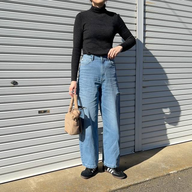 デニムパンツがゆったりとしたシルエットの場合は「ぴったりめのトップス」がハマります。例えばリブのタンクトップやタートルネックはうってつけ。ダボッっとしたパンツが引き締まり、40代らしいコーデに決まります。加えてスニーカーを合わせることで、タイトシルエットのトップスをスポーティに着こなせますよ。