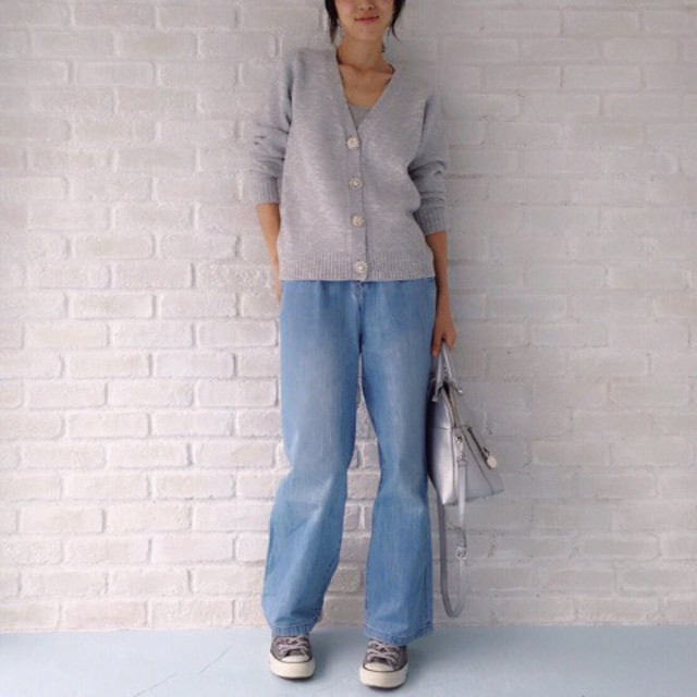 このときカーディガンは前を閉めて着るのがコツです。上半身がコンパクトにまとまる上にきちんと感がグンとアップ。デニムパンツとスニーカーのスタイリングがクリーンなルックスに決まります。