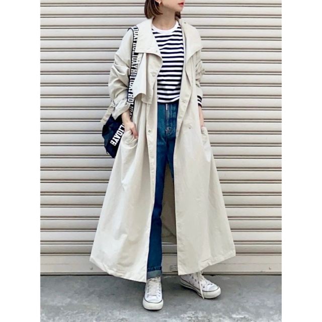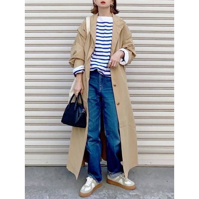アウターに迷ったときに頼れるのが「トレンチコート」。ガバッと羽織るだけでサマになり、デニムパンツとスニーカーがお出かけモードに印象チェンジされます。カッチリしたコートのおかげでカジュアルコーデが大人っぽいルックスに。