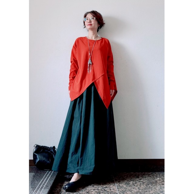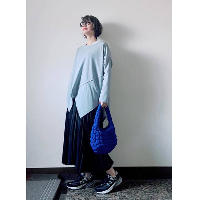 楽ちんなカジュアルトップスの中でも、着るだけでおしゃれに見えるのが「アシンメトリーのトップス」。裾が左右非対称になっているデザインを選ぶとスタイリッシュに決まる上に、ウエストまわりが目立ちませんよ。そもそもトップスアウトで着るデザインなので、サッとかぶるだけでサマになるのが嬉しいところ。