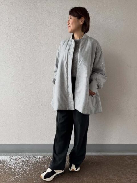 お尻がすっぽり隠れる丈感のコートはパンツスタイルと相性がよく、まさしく50代向け。生地が軽いコートを選ぶとより快適に過ごせますよ。