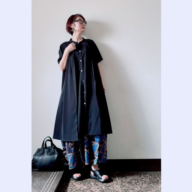 春夏秋の3シーズン使える「シャツワンピース」は50代に最適。生地にハリ感があるので、ゆったりとしたシルエットでもダラしなく見えません。