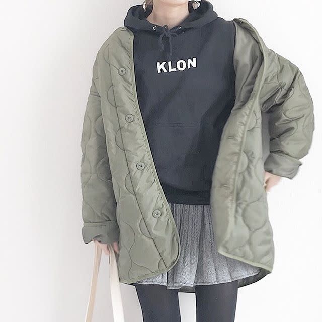 定番のカーキキルティングジャケットは黒パーカーのクールな雰囲気と相性バツグン。そのままカジュアルに着こなしてもオシャレですし、スナップのようにあえてガーリーなミニスカートで甘さを加えるのもおすすめですよ。