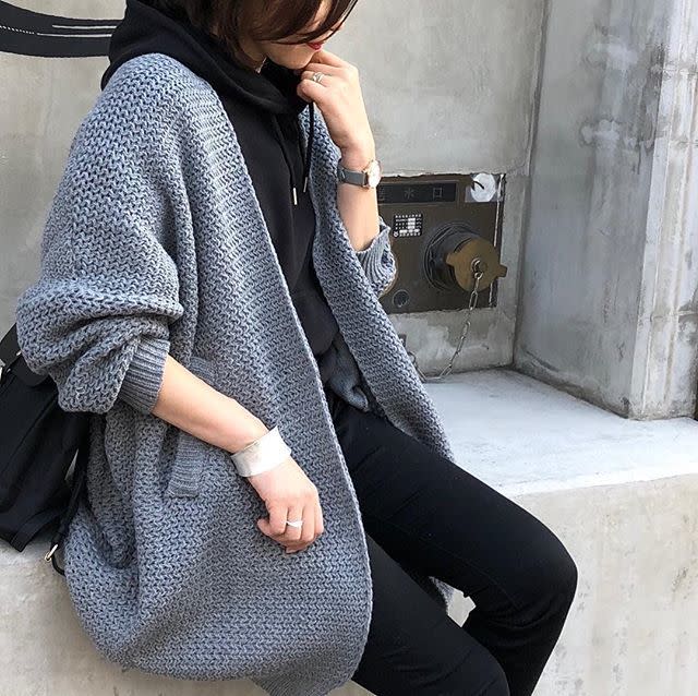 グレーニットカーディガン×黒パーカーの組み合わせもおすすめです。モノトーンでまとめて色味を抑えることで、パーカーのカジュアルコーデに洗練感をプラスすることができます。大人っぽいのに決めすぎない、そんな絶妙バランスが完成!