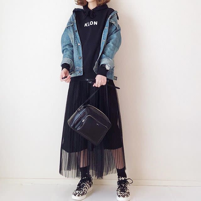 ブルーデニム×黒パーカーなら、青の爽やかさが加わってより軽やかな印象に。首元のレイヤードが可愛いのはもちろん、スナップではデニムジャケットの袖口も折り上げてパーカーをチラ見せ。このひとテクを加えるだけでコーデ全体のこなれ感もアップしますね。