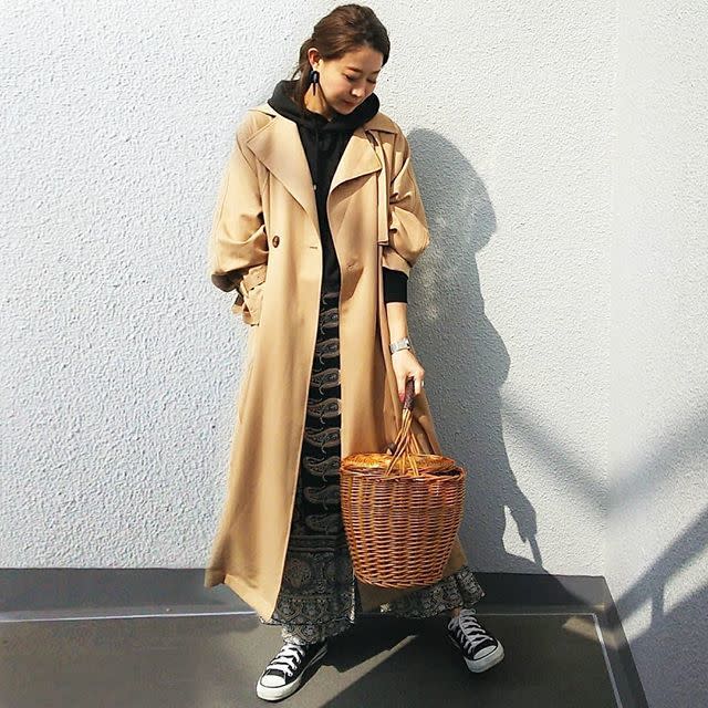 こちらは、トレンチコートとロングスカートを合わせたレディなスタイリング。そこにあえて黒パーカーをプラスすることでカジュアルな外しをON。きれいめアウターとも難なく合わせやすい黒パーカーだからこそ、こういったミックススタイルも簡単に楽しむことができますよ。