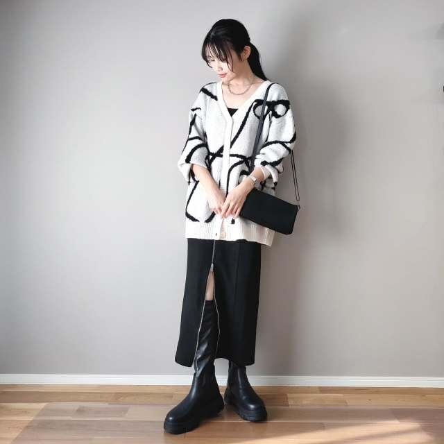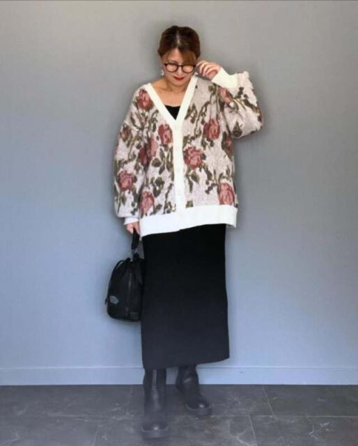 黒タイトスカートは「柄カーディガン」と相性バツグン。リボンや花柄などのインパクトが強い柄でも、ベーシックな黒タイトスカートと合わせれば派手見え感がありません。コーデが程よく落ち着き、おしゃれな装いに。