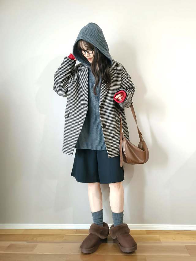 チェックコート×ニットフーディコーデ