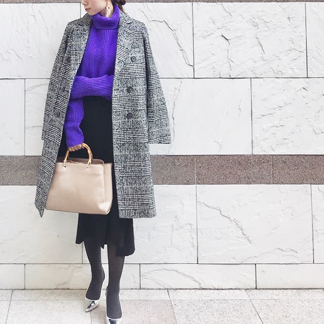 鮮やかなパープルニットには、モノトーンチェックのロングコートを合わせておしゃれな配色に。スタイリッシュなモノトーンチェックならどんな色のインナーも合わせやすく、コーデの幅が広がります。