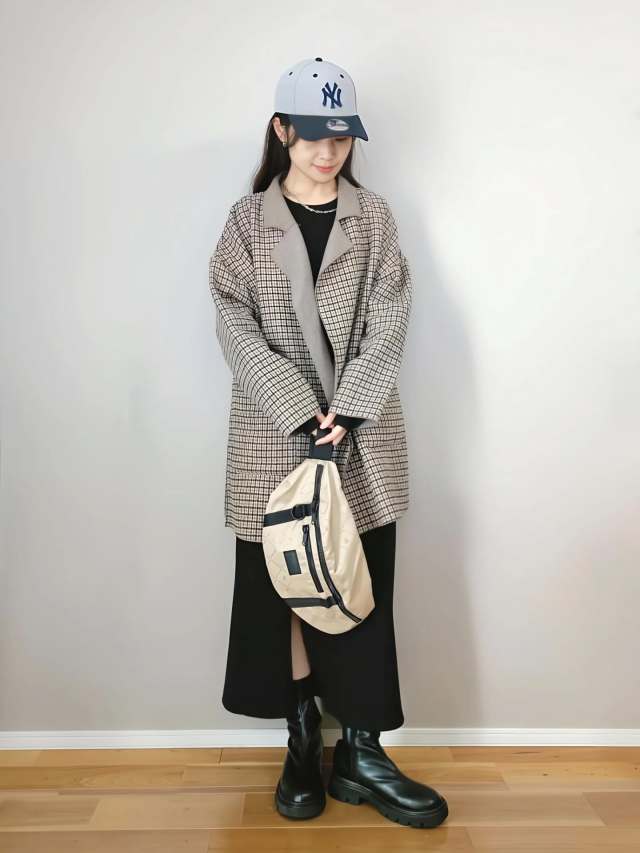 スナップは、チェックコートのインナーに黒ワンピースを合わせたコーデ。あえてキャップとボディバッグを添えて、きれいめなチェックコートをカジュアルダウンしています。