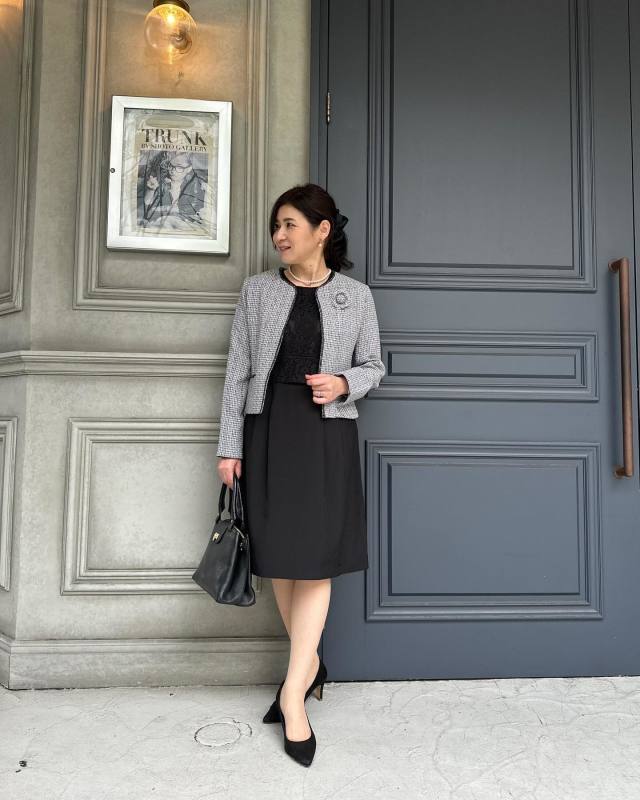 50代のお呼ばれコーデにツイードジャケットを活用するのも素敵です。例えばスナップでは、ひざ丈のブラックワンピースにグレーのツイードジャケットをON。パールアクセサリーを添えて、上品さをさらにクラスアップしています。