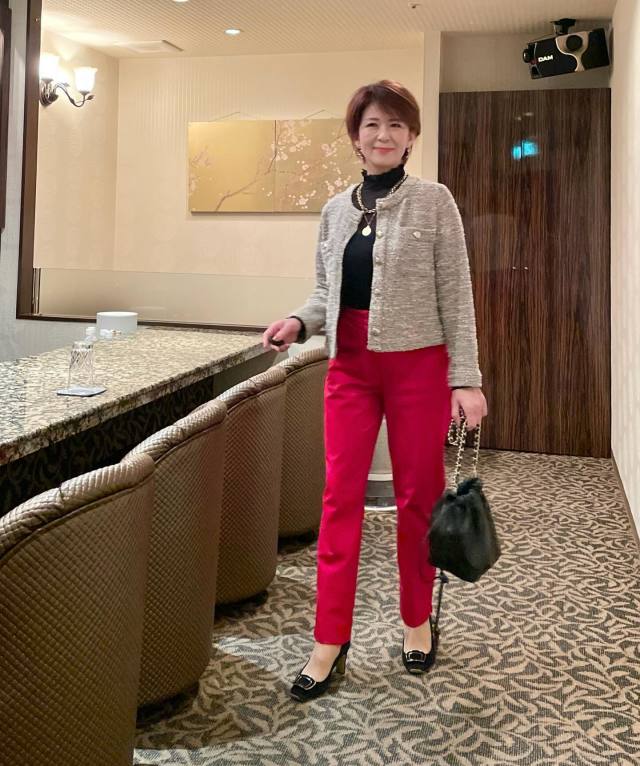 テーラードタイプのツイードジャケットはハンサムさが加わってかっこいい印象に。ツイード素材に加え、赤のブラウスや小物で少しレディさをミックスすると、50代に似合う華やかコーデが出来上がります。