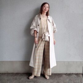 チェックパンツのきちんと感を生かすなら「大人っぽいロングコート」合わせが最適。布帛(ふはく)生地のロングコートは羽織るだけでお出かけモードの装いに。