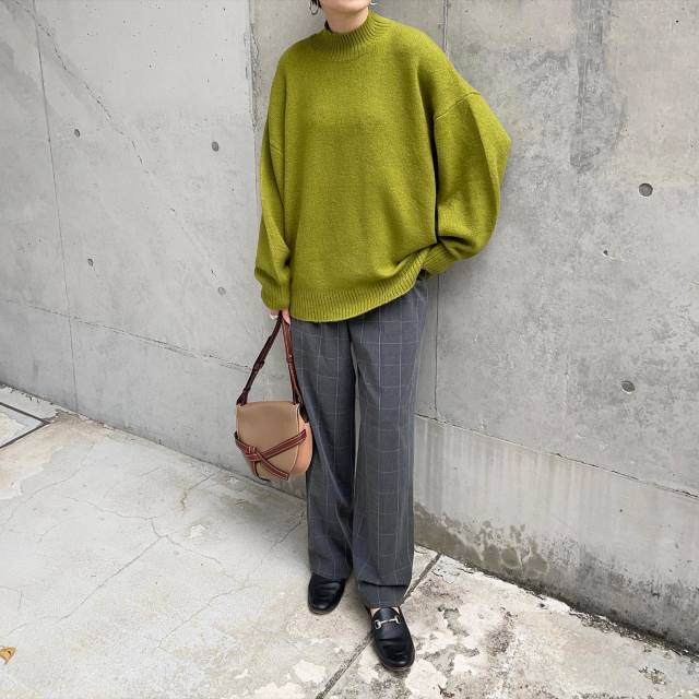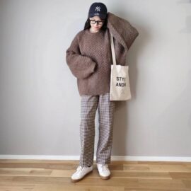 そもそもチェックパンツ自体におじさんっぽさがあるため、真面目に着ないのがスタイリングのコツ。そこでおすすめなのが「ボリューム袖ニット」合わせです。