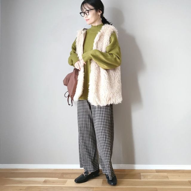 チェック柄パンツはもこもこのファーベストを品よく着こなしたいときにもお役立ち。パンツの定番感のおかげでコーデが落ち着きます。タウンユースしやすくなる上にシーズンムードに馴染みますよ。