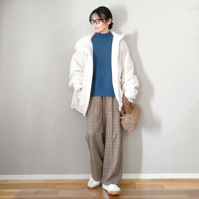 チェックパンツは「白のダウンジャケット」と相性バツグン。クリーンな色味&ボリューミーなシルエットのダウンが、トラッドになりがちなパンツを新鮮に見せてくれます。合わせるだけでサマになる着こなしに。