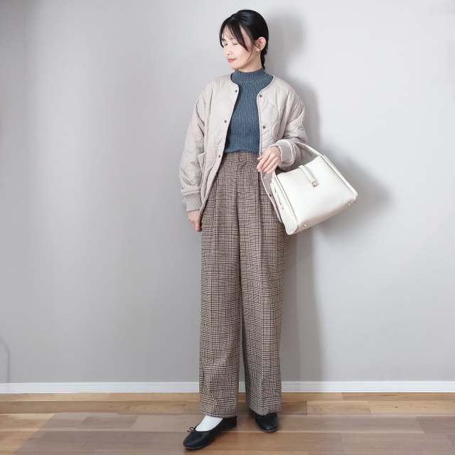 例えばスナップのようなレイヤード風デザインやスタンドカラーコートを選んでみては。リラクシーな雰囲気が高まり、チェックパンツコーデが今っぽくこなれて見えますよ。