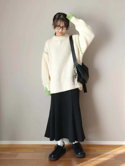 万人受けを狙える色といえば白。ゆったりシルエットが可愛いニットで取り入れれば飲み会でリラックスできそうです。袖口や首回りに切り替え配色を利かせたバイカラーニットなら、シンプル過ぎずどこかこなれた印象に。