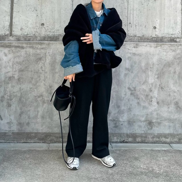 デニムジャケットにファー素材のベストを重ねれば、より冬らしい季節感を楽しむことができますよ。ファーの立体感がコーデの奥行きまでアップしてくれます。さらにオーバーサイズのデニムジャケットなら、ベストやジレを重ねることで重心が上がり、スタイルアップが叶うメリットもアリ。