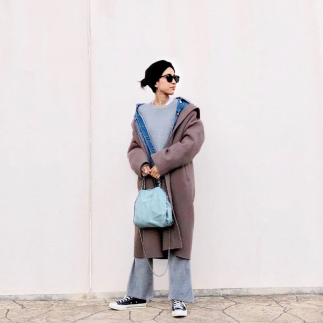 アウター2枚重ねなので、真冬の寒さもしっかり防寒できますよ。万能素材のデニムだからこそ、上に重ねるコートの色も選びません。