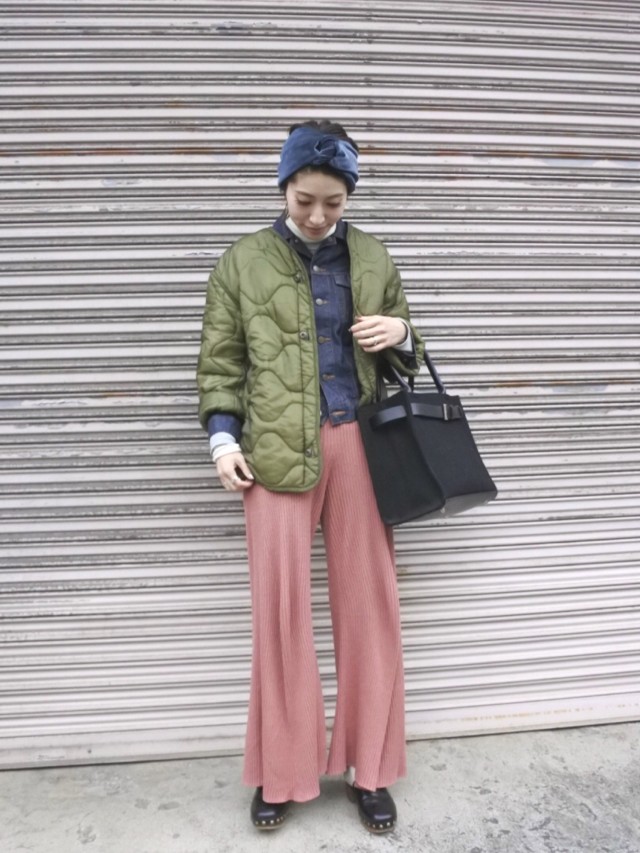 デニムジャケット×キルティングコート×カラーボトムス