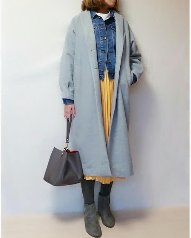 デニムジャケットの上にライトグレーのチェスターコートを羽織ったこちらのスタイリングは、デニムとロングコートの色差が控えめなのでまとまった印象に。アウターの色味を抑えているので、パッと目を惹くイエロースカートを合わせても難なくなじみます。