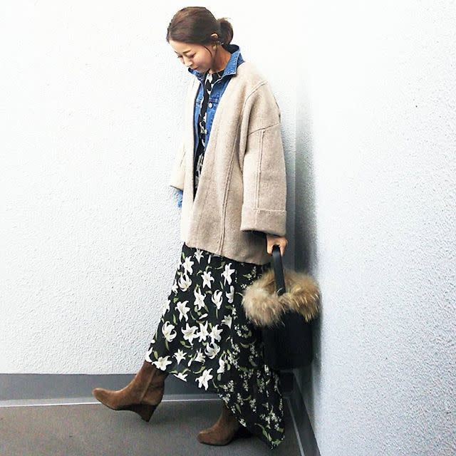 デニムジャケット×ミドルコート×花柄ワンピース
