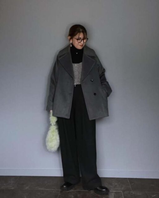「Pコート(ピーコート)」はミドルコートの一種で端正なムード。厚手生地にダブルブレスト仕様、リーファーカラーと呼ばれる大きな襟が特徴です。パンツはもちろん、スカートやワンピースとも相性よく決まります。