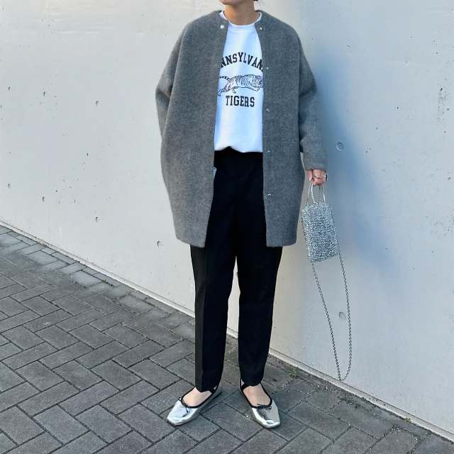 コートのデザインでトレンドの影響を受けやすいのが、実は襟。その点「ノーカラーコート」なら流行に左右されない上に、ロングシーズン着用できます。