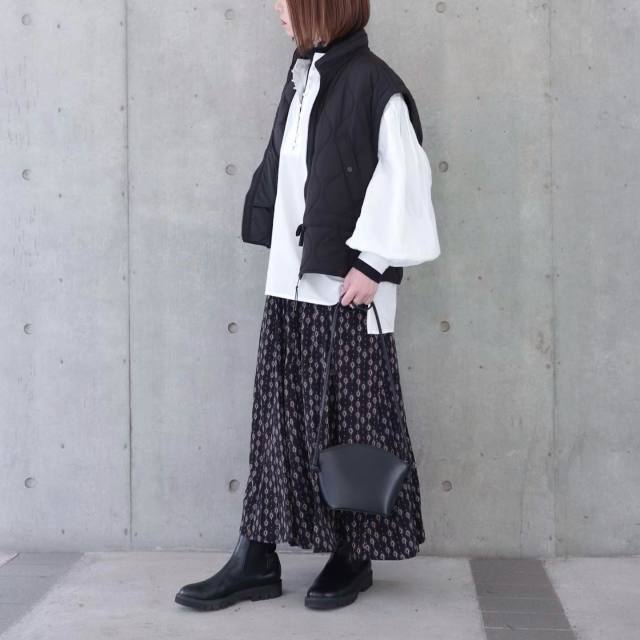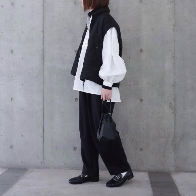 きれいめに着こなしたいときは「ボリューム袖のブラウス」がお役立ち。このときダウンベストを黒、ブラウスを白で取り入れると、コーデがお出かけモードに。黒×白のコントラストと甘いブラウスの合わせ技でダウンベストのアウトドア感が軽減され、クリーンな装いに仕上がります。