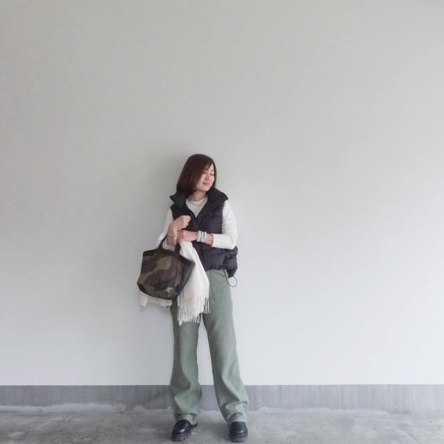 下に着たトップスは裾を出したままで大丈夫。ボリューミーなダウンベストのおかげで立体感が生まれ、のっぺり見えません。