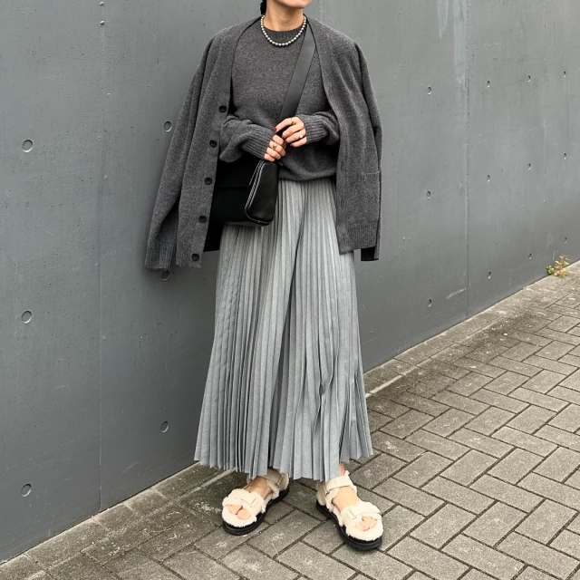 1|ふわふわグレーカーディガン×ツヤスカートでこなれる