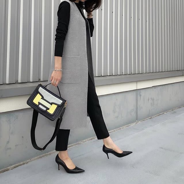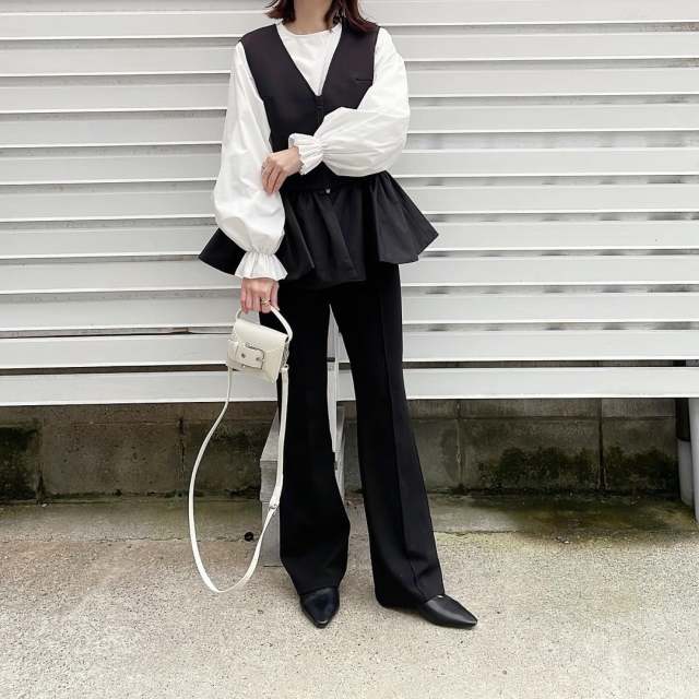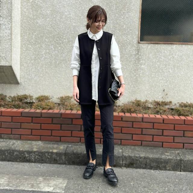 黒のロングジレ・べスト|黒パンツ×白のきれいめブラウスを合わせる