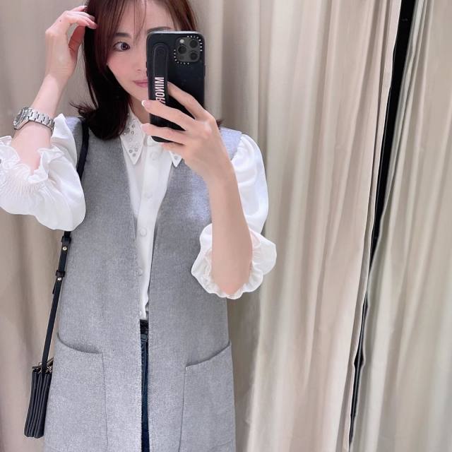 ノーカラーのシンプルなジレ・ベストの場合は、「白のボウタイブラウス」を合わせるのがおすすめ。顔まわりが華やぐ上にフォーマル感があるトップスなので、コーデがサマになります。