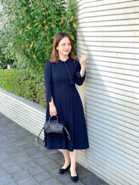 「ダークカラーのフォーマルワンピース」は一枚でサマになる優れモノ。コートを羽織るだけで卒業式コーデが完成します。
